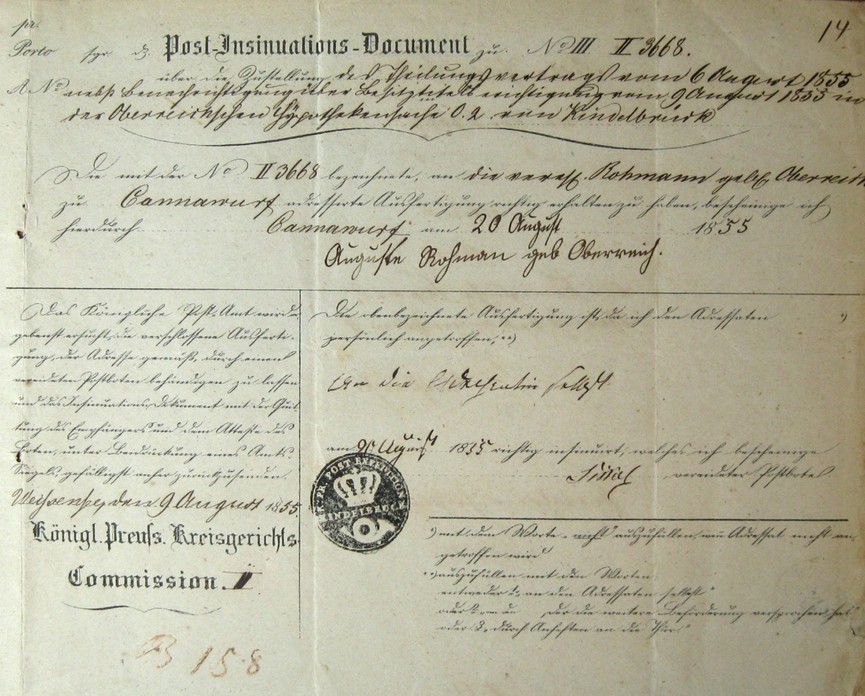 Das Post-Insinuations-Dokument von 1839 (Vorder- und Rückseite) ist eine Zustellungsurkunde, auf dem der Zusteller Tag, Uhrzeit und persönliche Übergabe bestätigt. Ab 1839 wurden in Preußen vorgedruckte Behändigungsscheine eingeführt. Auf diesem Schein wird die "richtige Insinuation" vom Briefträger bescheinigt.